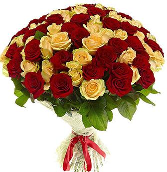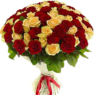 Состав: роза красная 51, роза кремовая 50, упаковка сизаль 1, лента шелковая 1